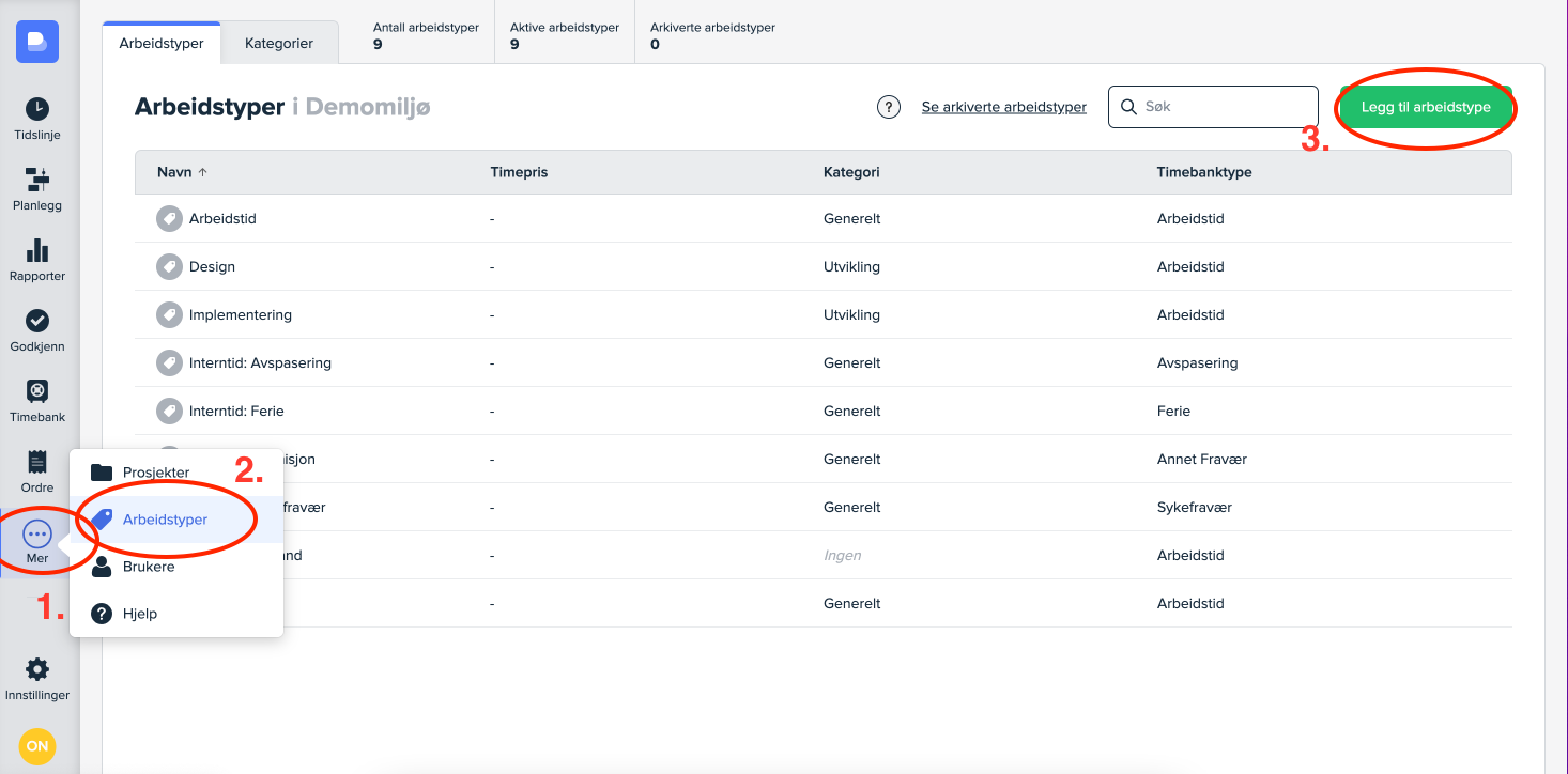 For å opprette en arbeidstype går du til sidemenyen, og trykker på «Mer» (1) → «Arbeidstyper» (2). Trykk så på «Legg til arbeidstype» (3) øverst til høyre.