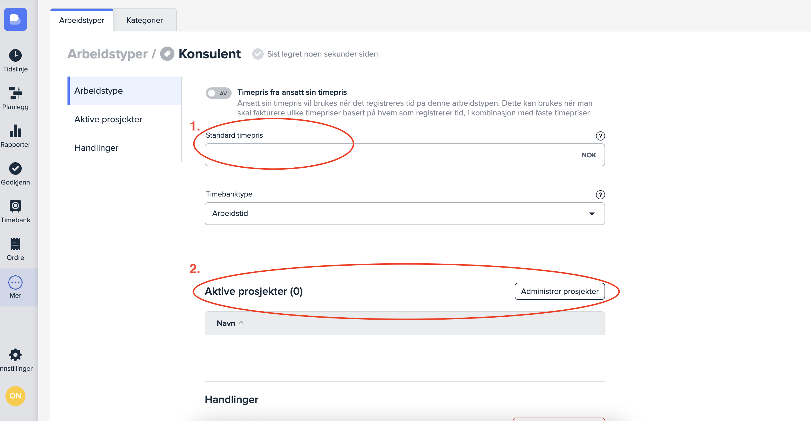 Trykk til slutt på «Lagre» for å opprette arbeidstypen. Du vil da komme til en «innstillingsside» for arbeidstypen. Her kan du velge en standard timepris på arbeidstypen (1) dersom dere har en. Du kan også legge til arbeidstypen på prosjekter ved å trykke på «Administrer prosjekter». Husk at arbeidstypen må ligge på et prosjekt for å være synlig ved timeføring!