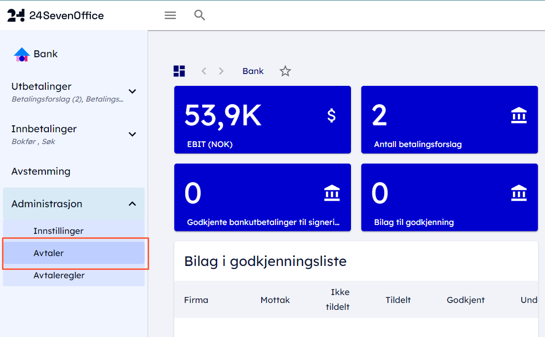 Du setter opp en bankavtale under Bank --> Administrasjon --> Avtaler.