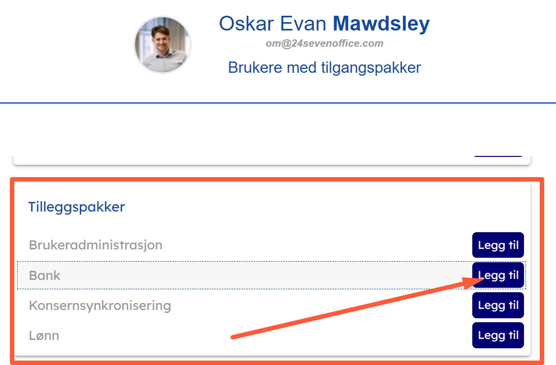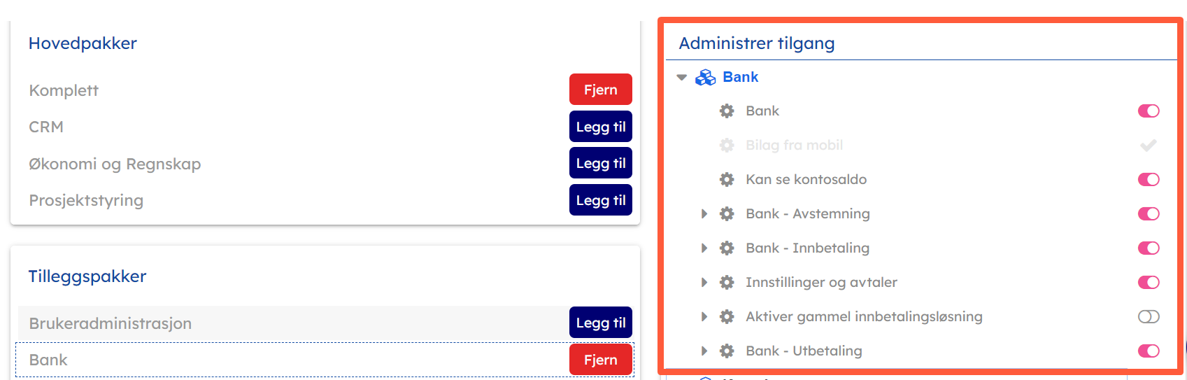 Tilgang til bank- For at du skal kunne bruke bankmodulen må du ha tilgang til pakken i brukeradministrasjon som heter Bank. Der kan det settes opp hvilke tilganger du skal ha i bankmodule.