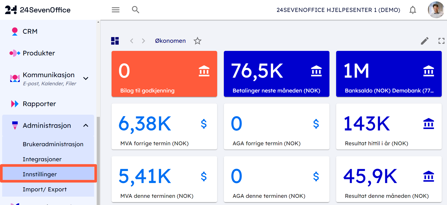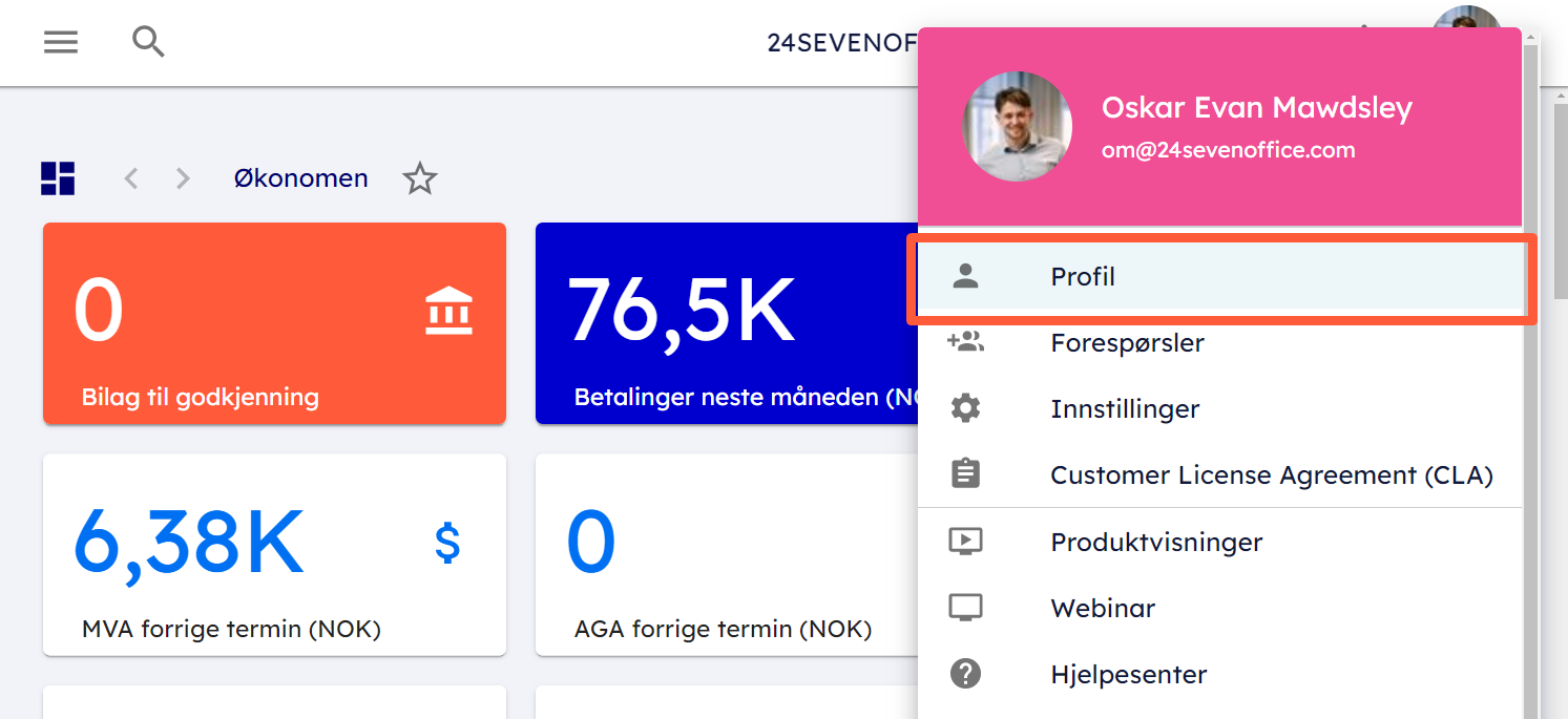 For å kunne signere betalingene i bankmodulen, må du gjennom to-steg- Legge til telefonnummeret ditt på din profil. Denne finner du under bruker-ikonet ditt i høyre hjørne --> Profil.