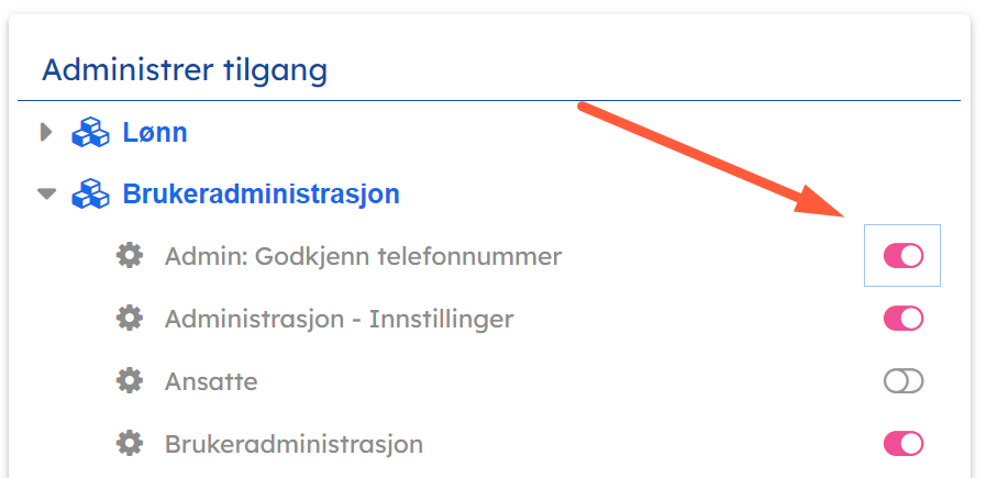 Vi får en meny på høyre side under brukeradministrasjon må vi skru på "Admin: Godkjenn telefonnummer"