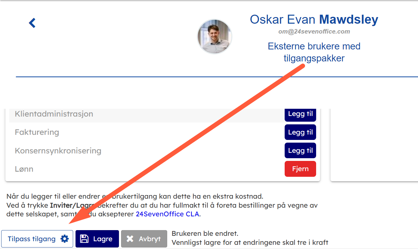 - Om du bare trenger tilgang til for eksempel utbetaling eller innbetaling, kan dette tilpasses ved å trykke på Tilpass tilgang. Du vil da få opp et nytt vindu til høyre. Hvor du kan administrere dette.