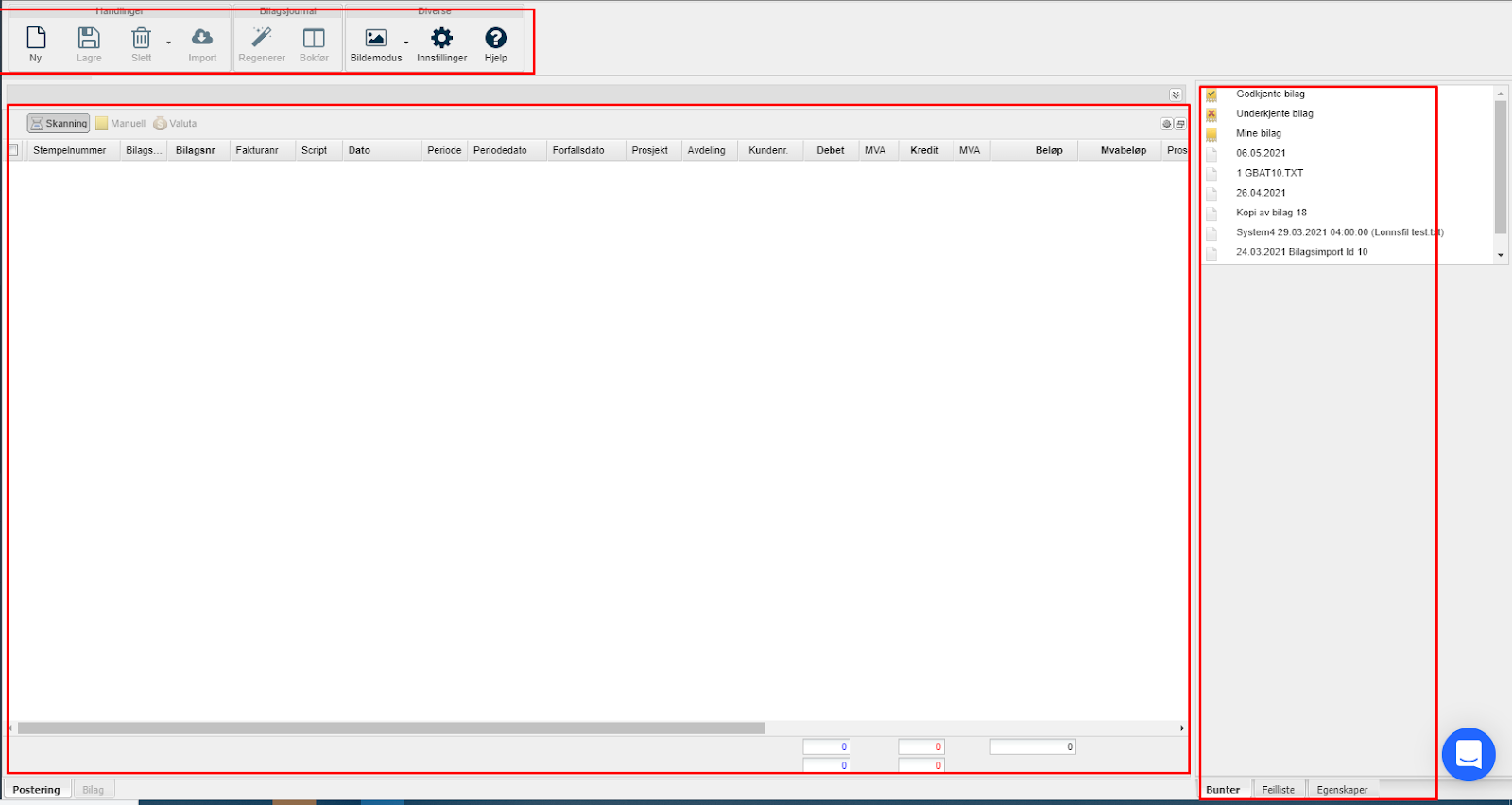 Bokføringsmodulen består av en meny på toppen, selve bokføringsbildet hvor du konterer og bokfører, og på høyre side et vindu med alle bunter, eventuelle feilmeldinger og egenskaper.