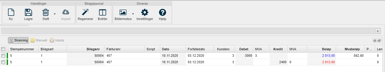 Regenerer: Oppdaterer bilagsnummer til det neste ledige på alle bilag i bunten.
