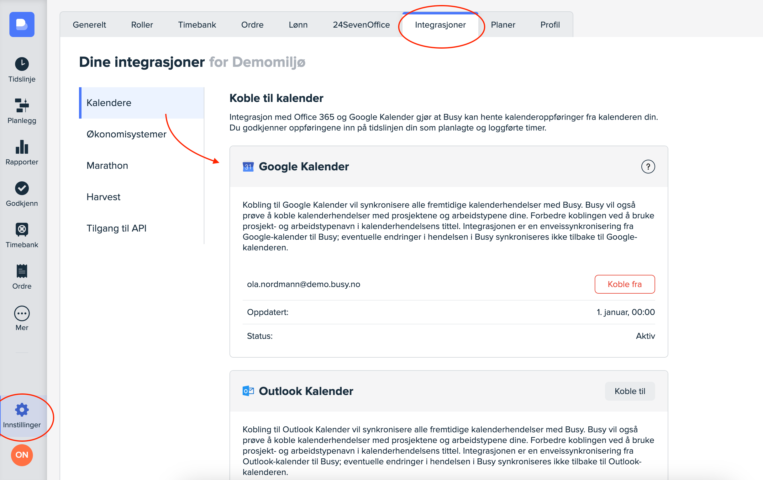 For å få opp møter og planlagt tid fra din Google eller Microsoft kalender, må du integrere denne med Busy. Dette gjøres ved å gå til «Innstillinger» → «Integrasjoner».