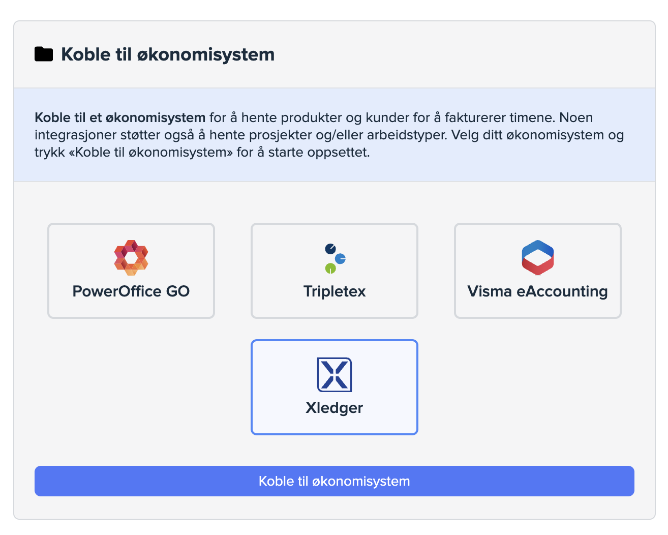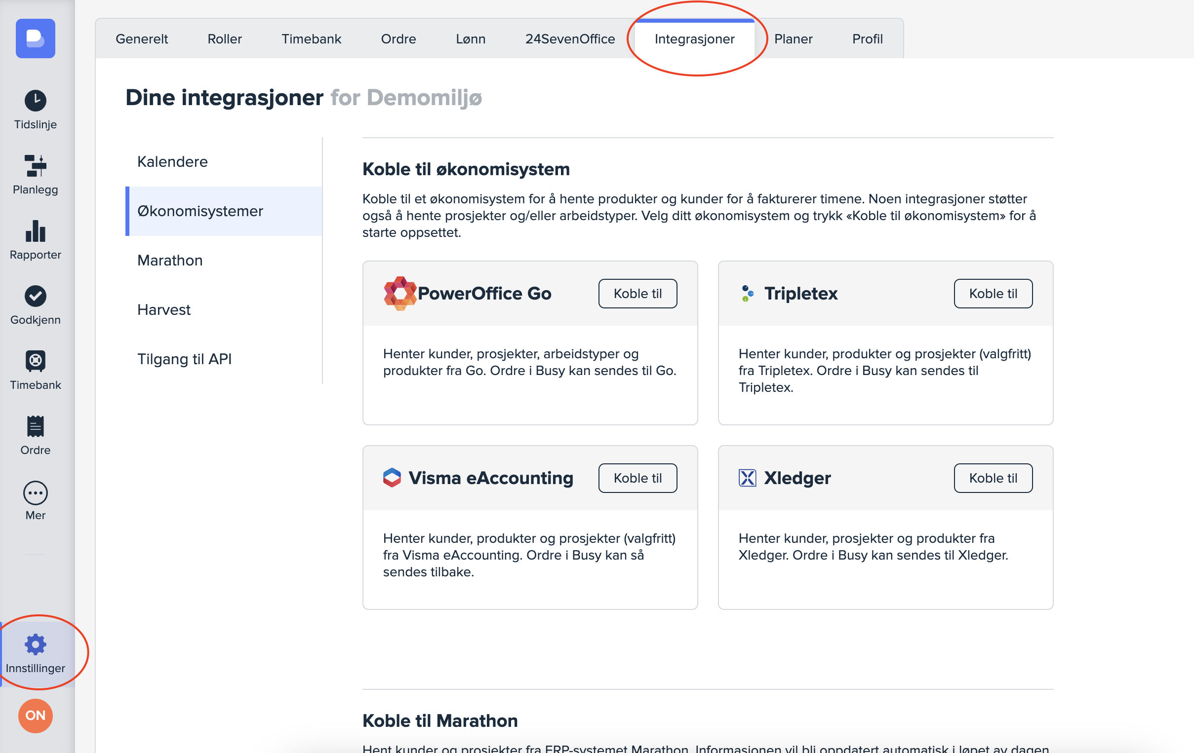 Vi har egne hjelpeartikler knyttet til oppsettet av hver enkelt integrasjon: Marathon ERP, PowerOffice GO, Xledger, Tripletex og Visma eAccounting.
