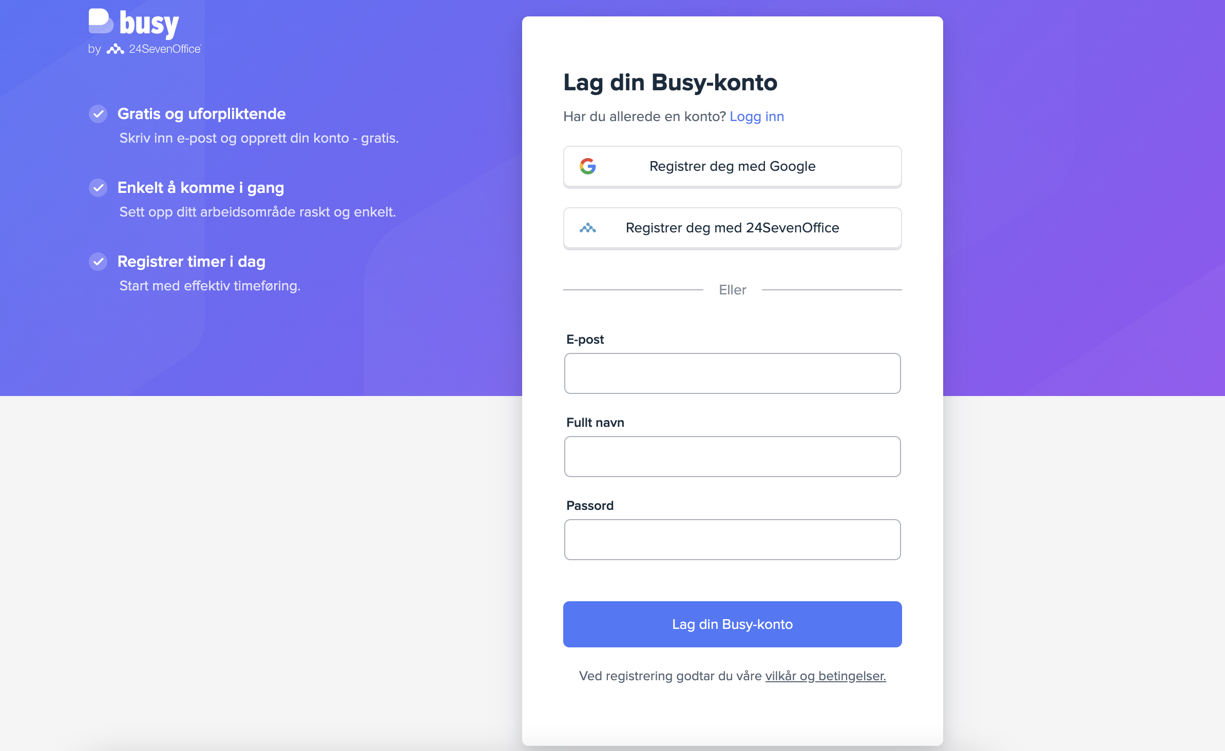 Første steg for å begynne å bruke Busy er å opprette en bruker. Det er to måter man kan opprette en bruker i Busy på: den ene er uten invitasjon, og den andre er med invitasjon.