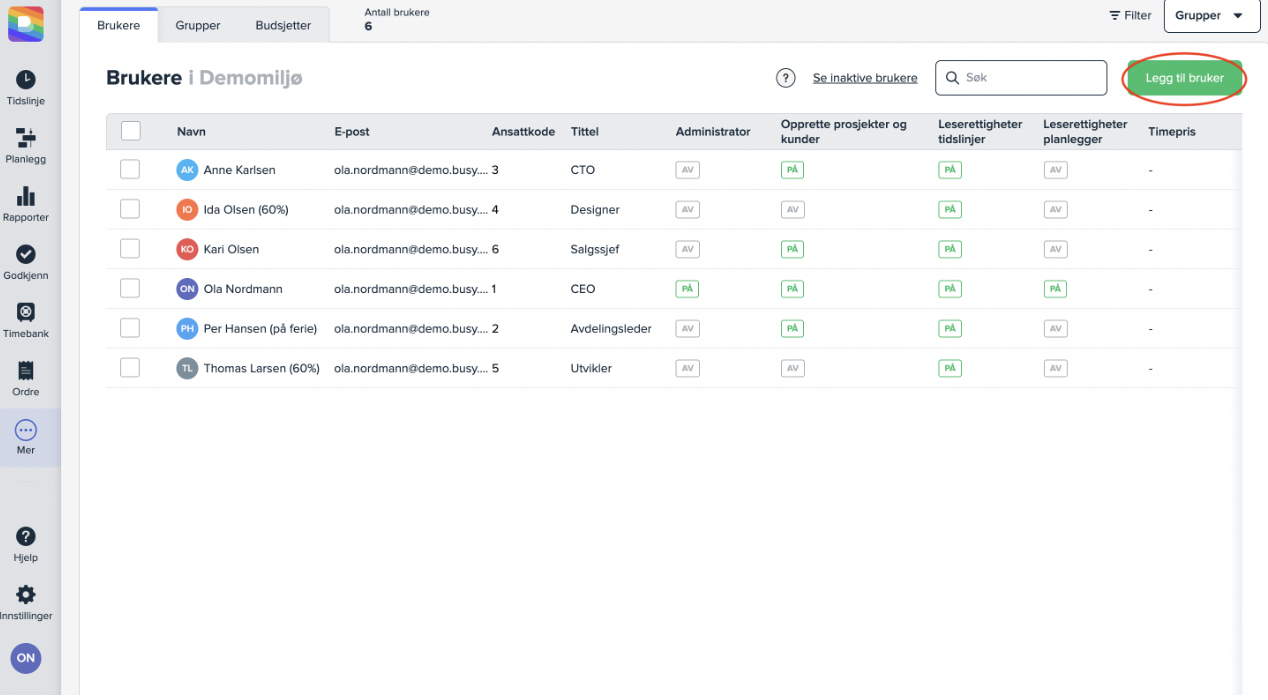 Neste steg i oppsettet av Busy er å invitere dine ansatte til arbeidsområdet. Dette gjøres under «Brukere» ved å trykke på «Legg til bruker».