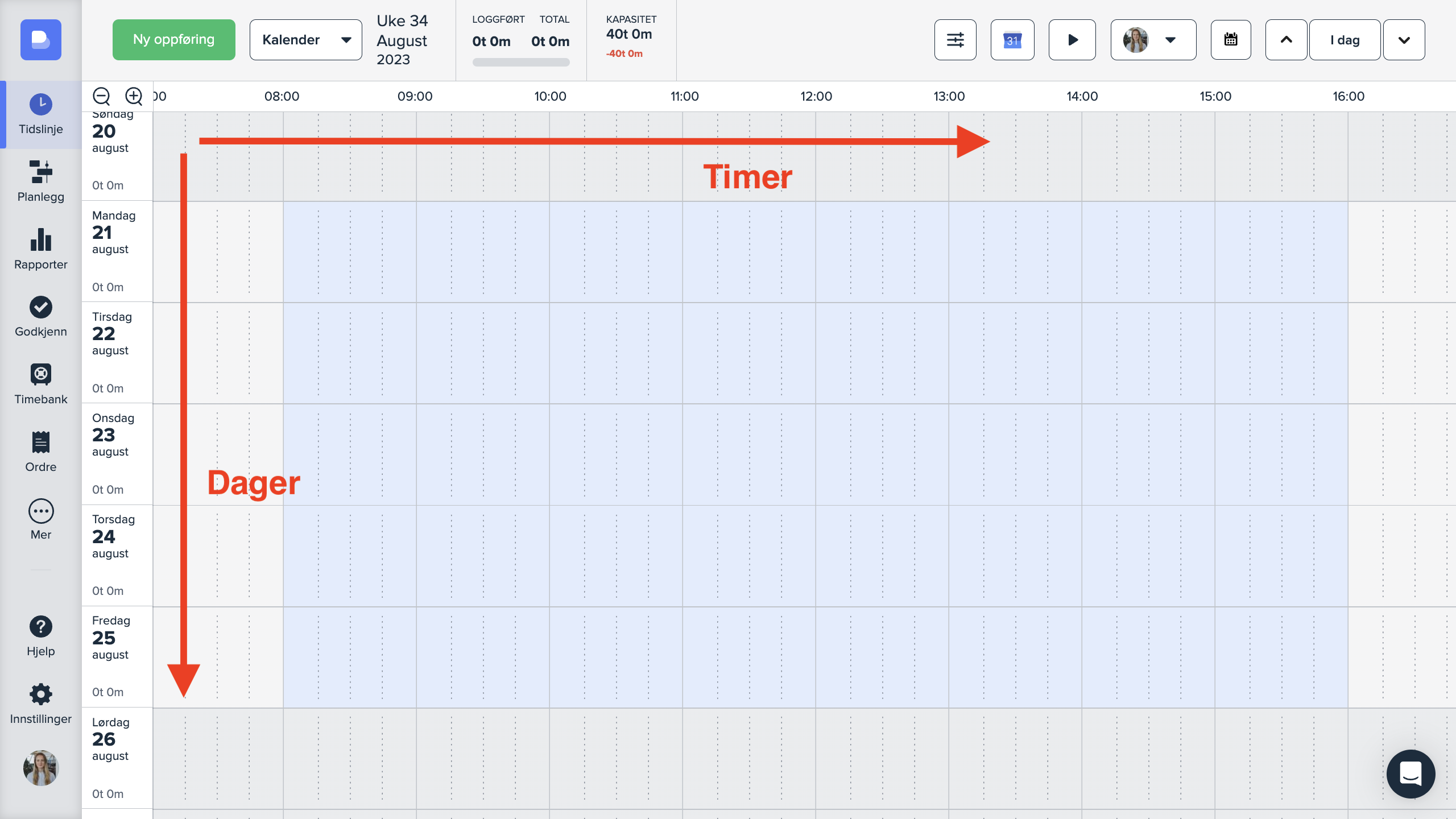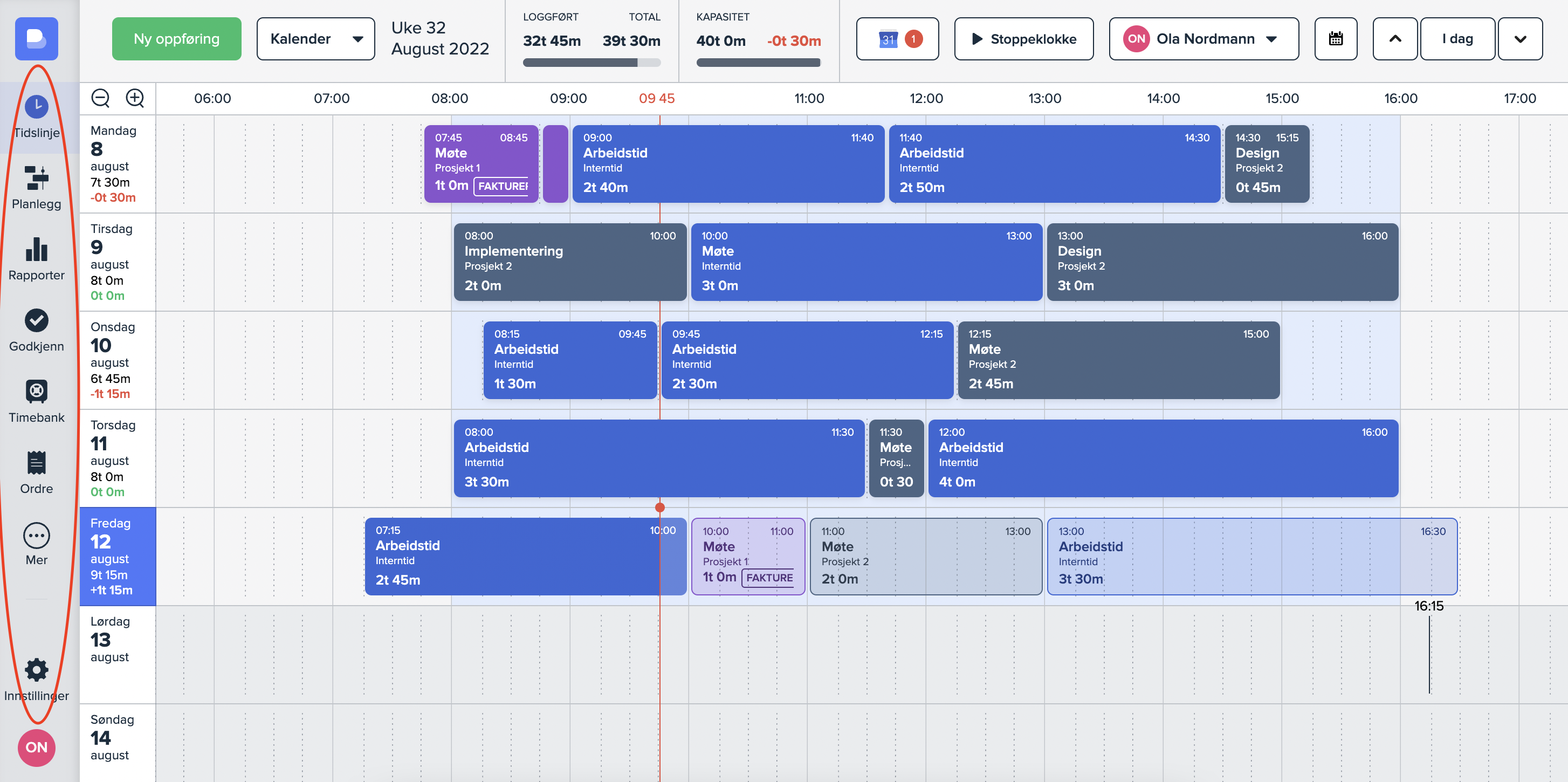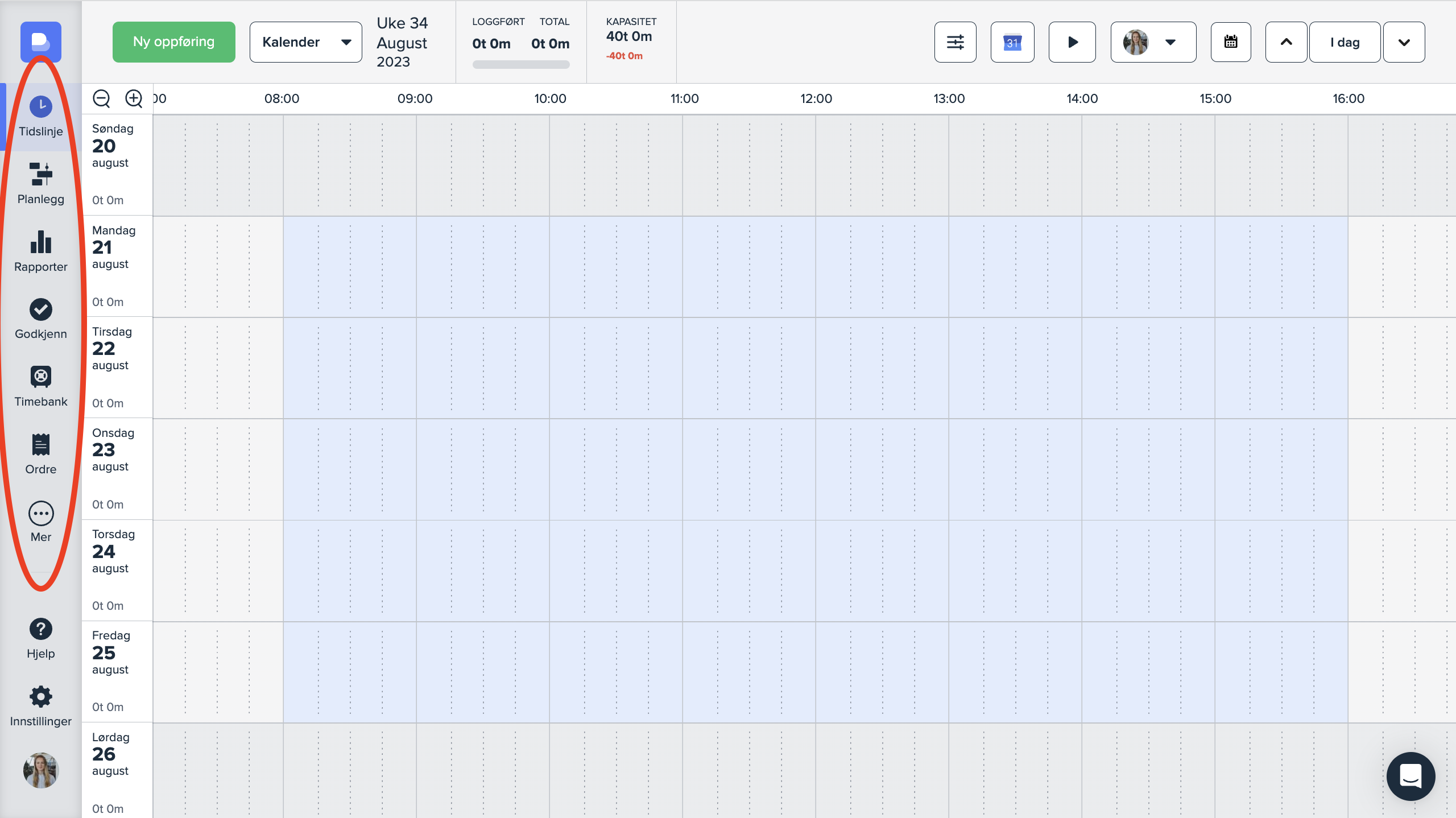 Modulene som finnes i sidemenyen er «Tidslinje», «Planlegg», «Rapporter», «Godkjenn» og «Timebank».