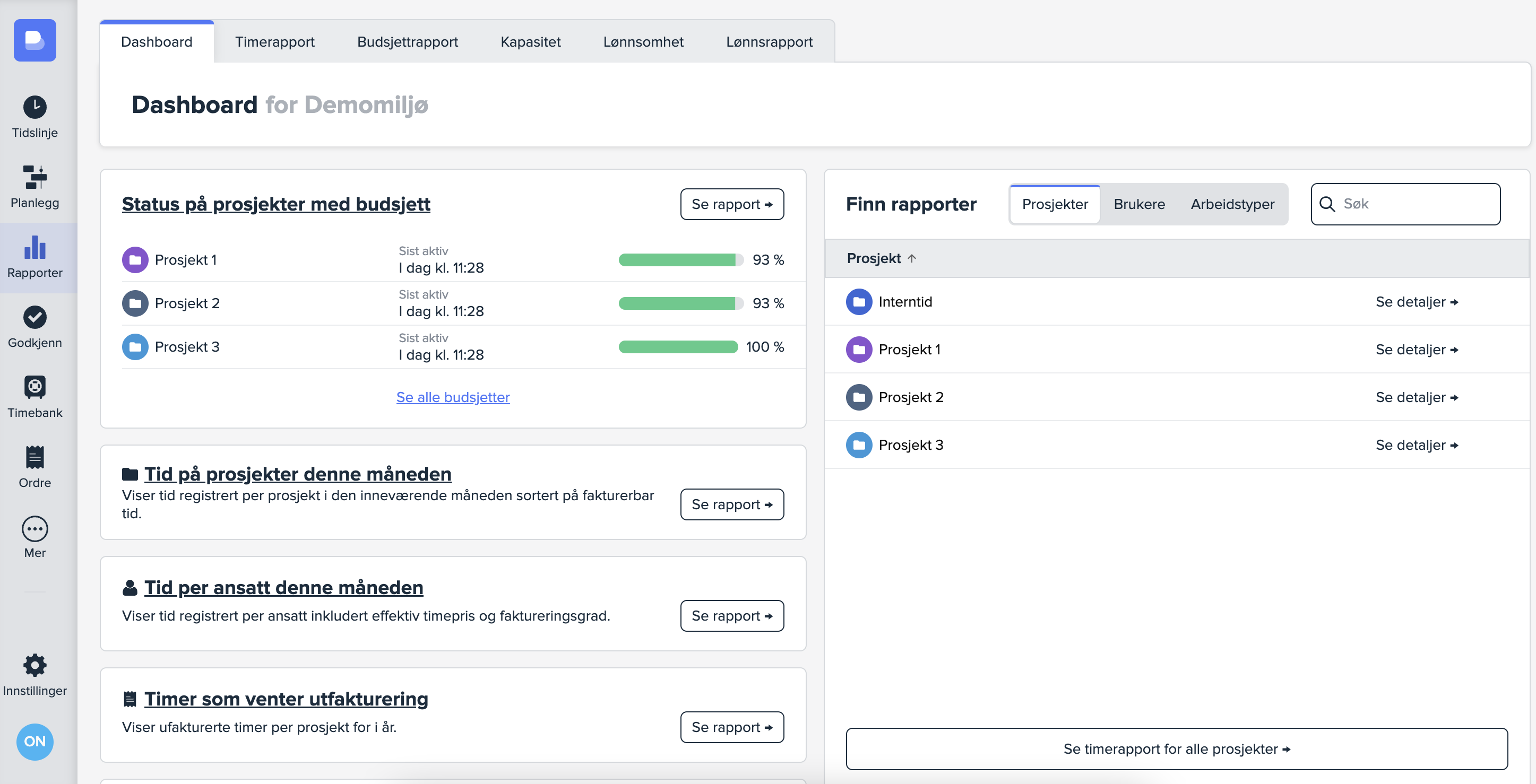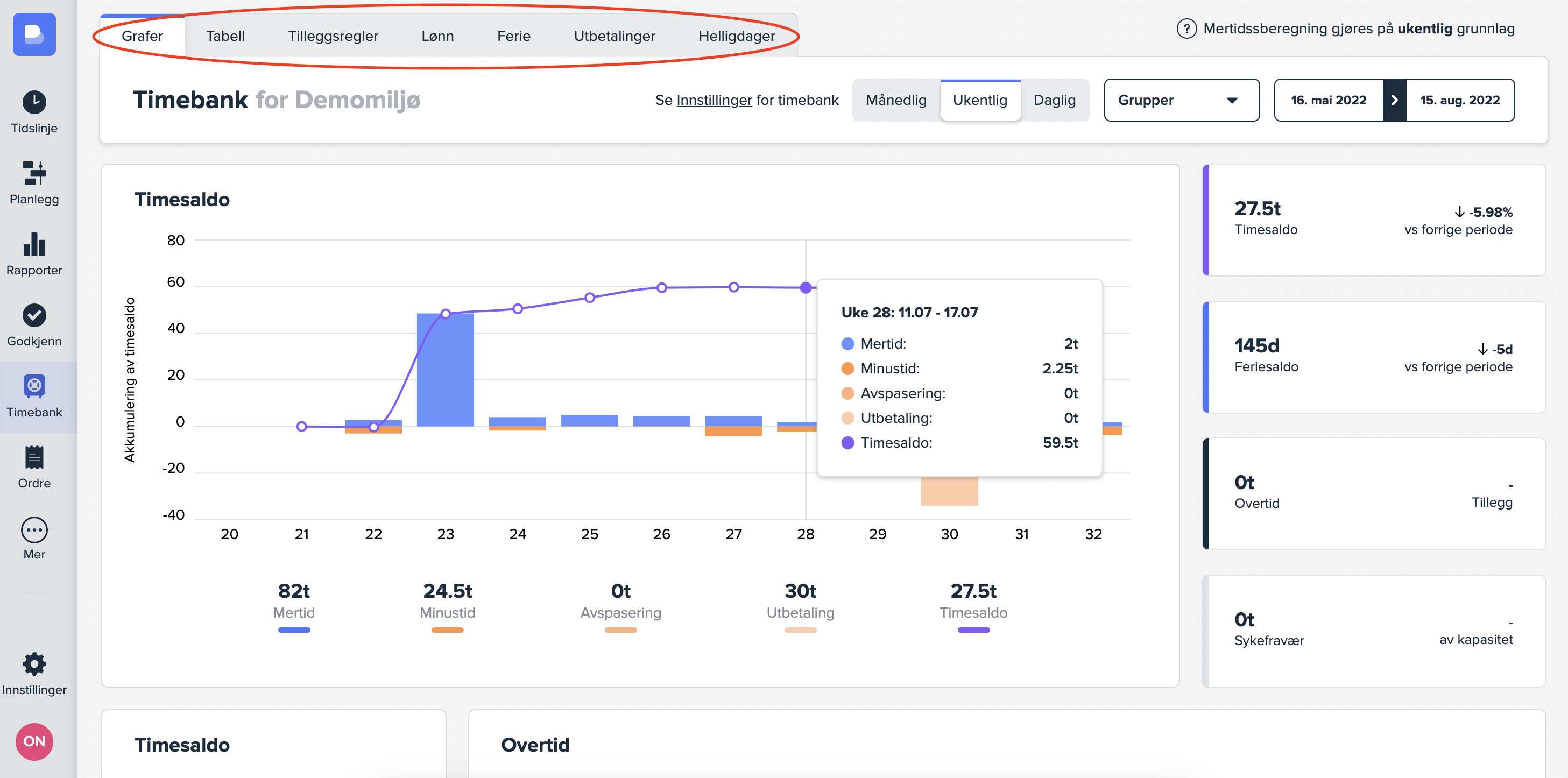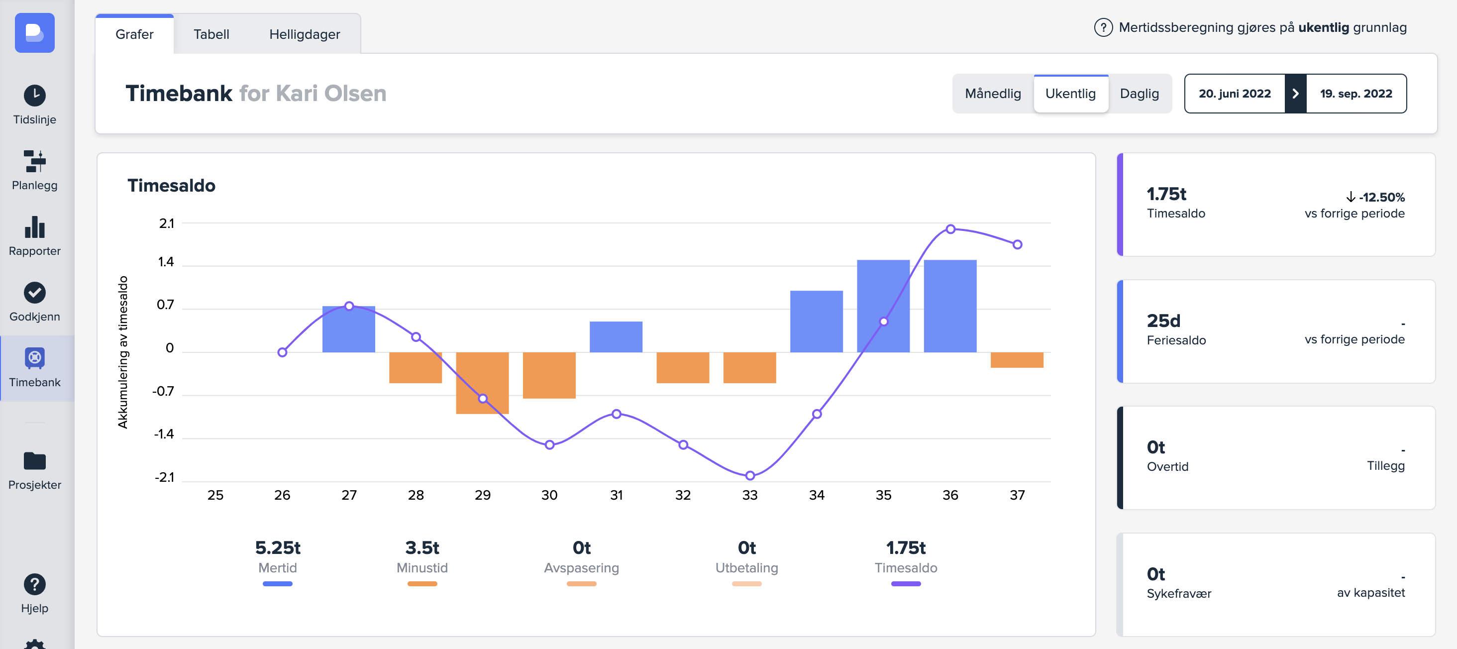 Modulene som finnes i sidemenyen er «Tidslinje», «Planlegg», «Rapporter», «Godkjenn» og «Timebank».