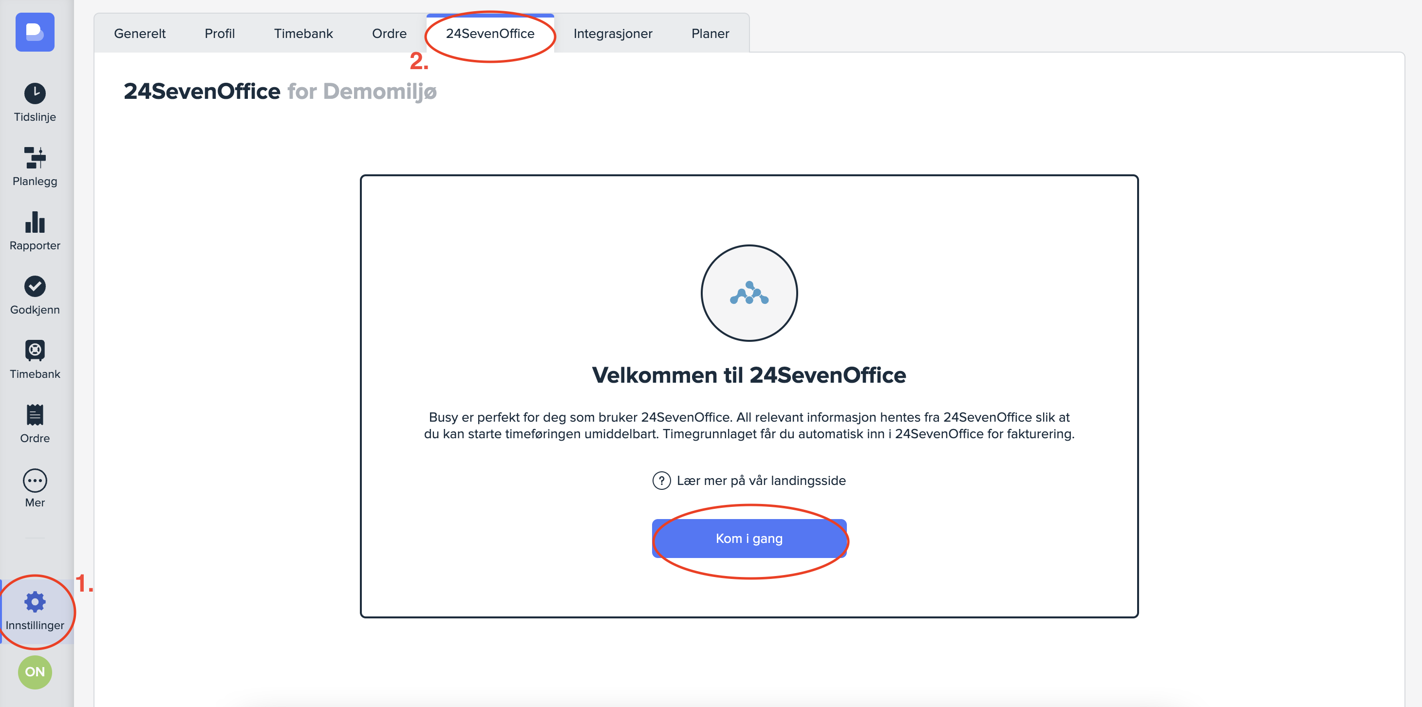 Busy støtter en rekke ulike økonomisystemer som kan kobles direkte til applikasjonen. For å integrere ditt økonomisystem med Busy går du først til «Innstillinger» (1) og trykker på «Integrasjoner» (2) i menyen øverst i vinduet.