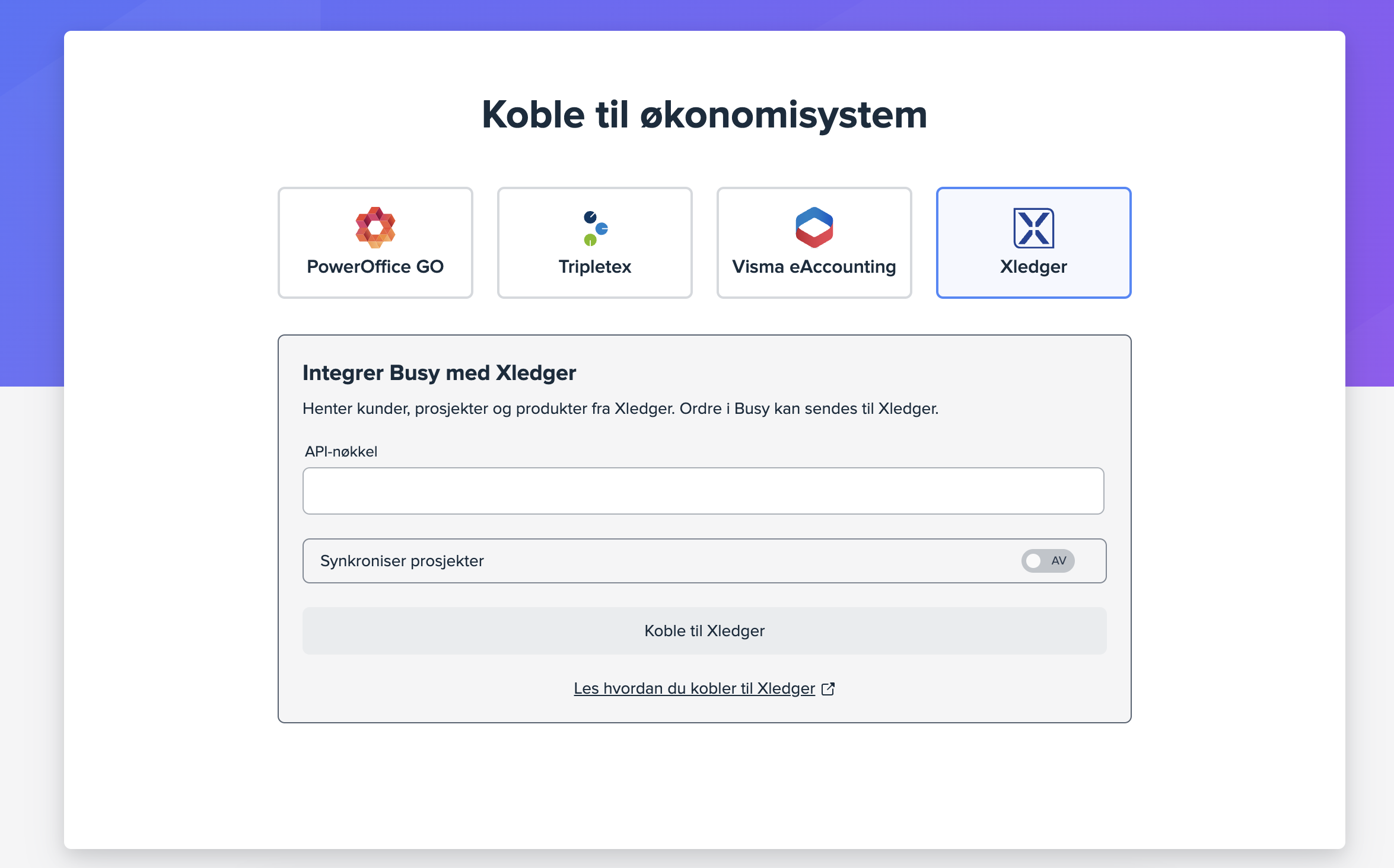 Her vil du få opp de ulike økonomisystemene Busy har integrasjon til i dag. Felles for å sette opp disse integrasjonene er at du får en API-nøkkel/brukernøkkel (en lang tekst) fra ditt økonomisystem, som du limer inn i Busy.