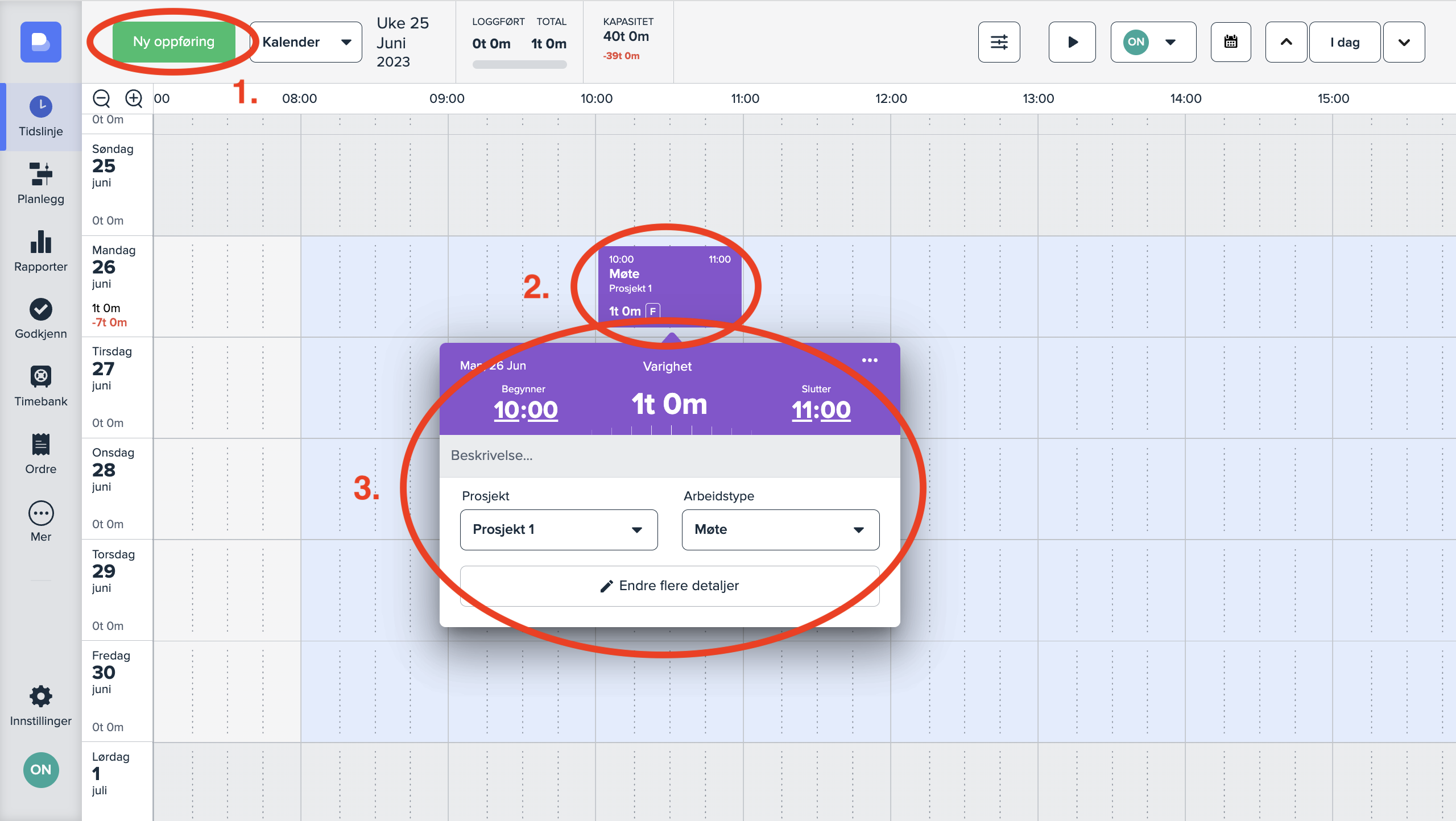 I tillegg til at kalenderen din vil bli importert som planlagt tid, kan du selv føre inn eller justere timene du arbeider, slik at den totale timeføringen blir korrekt. Dette gjøres enten ved å trykke på «Ny oppføring» (1), eller ved å ta i bruk «Klikk og dra-funksjonen» (2). Du kan justere detaljene i popup-vinduet (3). En detaljert oversikt over hvordan du fører timer i Busy kan du få ved å lese vår hjelpeartikkel: «Hvordan registrere timer på datamaskinen?»