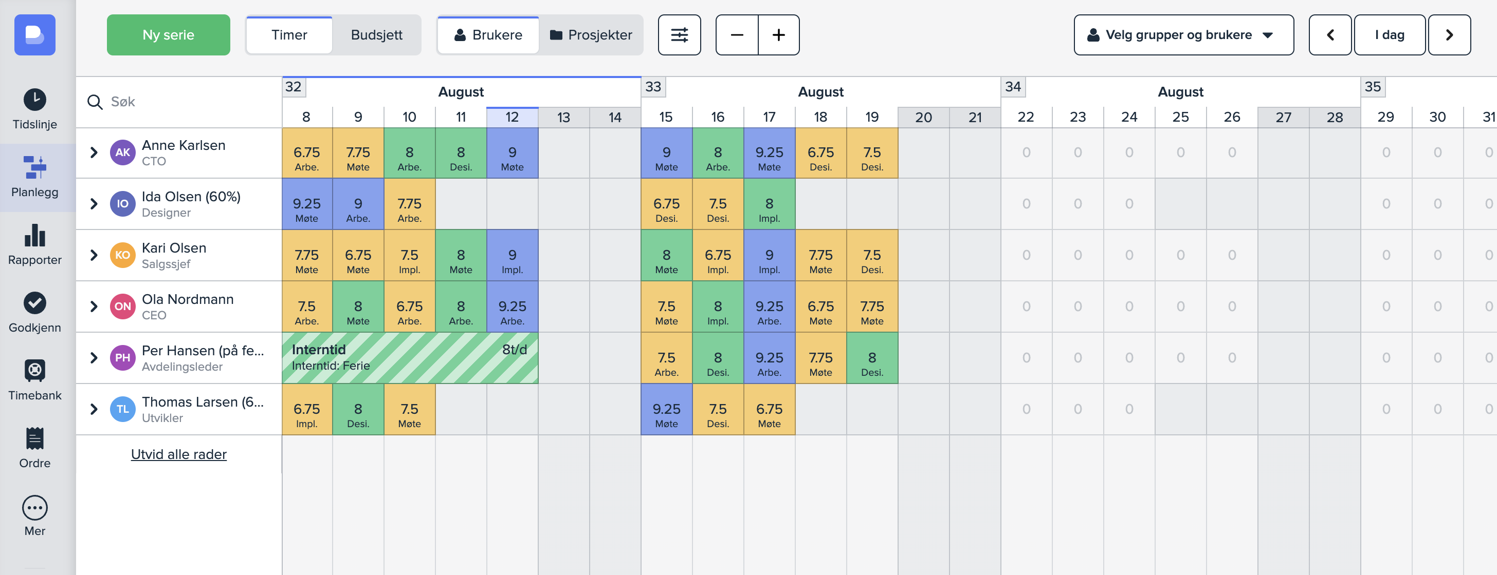 Tidslinjen: Tidslinjen brukes på samme måte som hos vanlige ansatte, men en administrator har tilgang til alle ansatte sin tidslinje. Dette betyr at du kan føre og planlegge timer på alle brukere i arbeidsområdet, ikke bare deg selv.