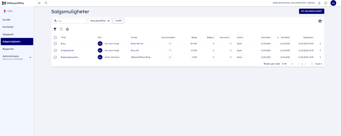 - Få en totaloversikt over salgsmuligheter via utlistingen på forsiden, med ulike filtre og grupperings-muligheter. Du kan eksempelvis filtrere salgsmuligheter på sannsynlighet, verdi, type, steg, beløp, status (åpen, vunnet eller tapt), for å nevne noe.