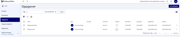 - Bruk oppgaver på kundekortet for å følge opp en kunde. Her finner du også en rekke enkle og mer avanserte filtreringsmuligheter knyttet til status, startdato, sluttdato, kunder etc.