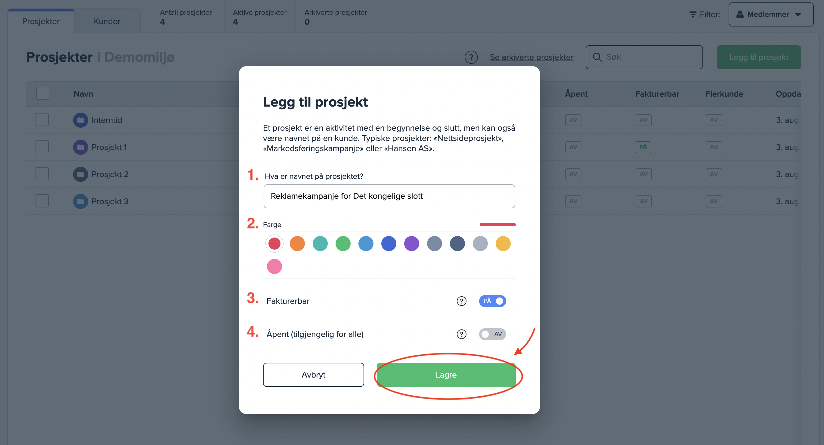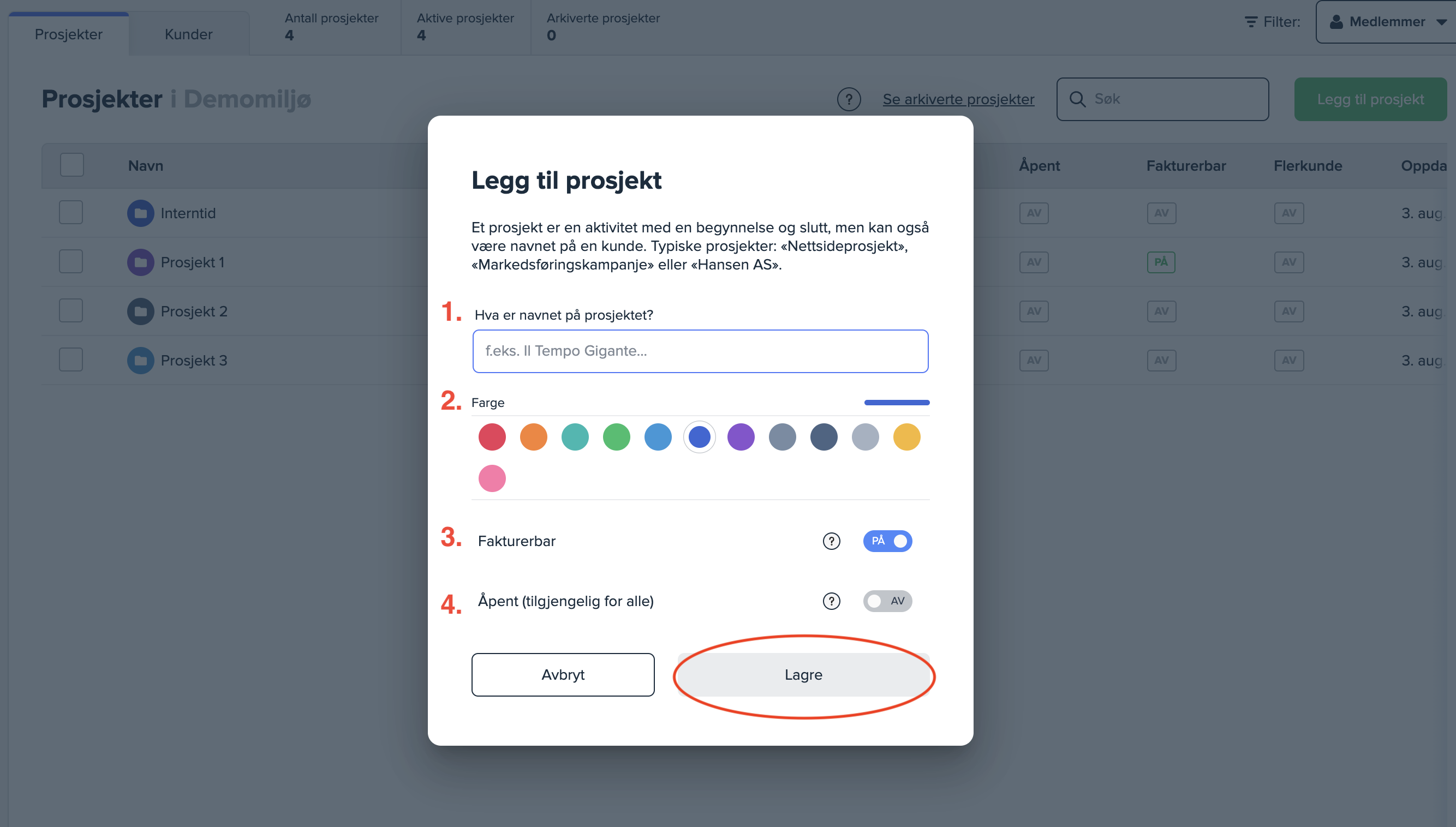 Et nytt vindu vises, der man fyller ut detaljene for det nye prosjektet. Et prosjekt representerer pågående arbeid i bedriften, og har et navn (1), en valgfri farge (2), kan være fakturerbart (3) og kan være åpent (4). Når du har valgt innstillinger trykker du på «Lagre» for å opprette prosjektet.
