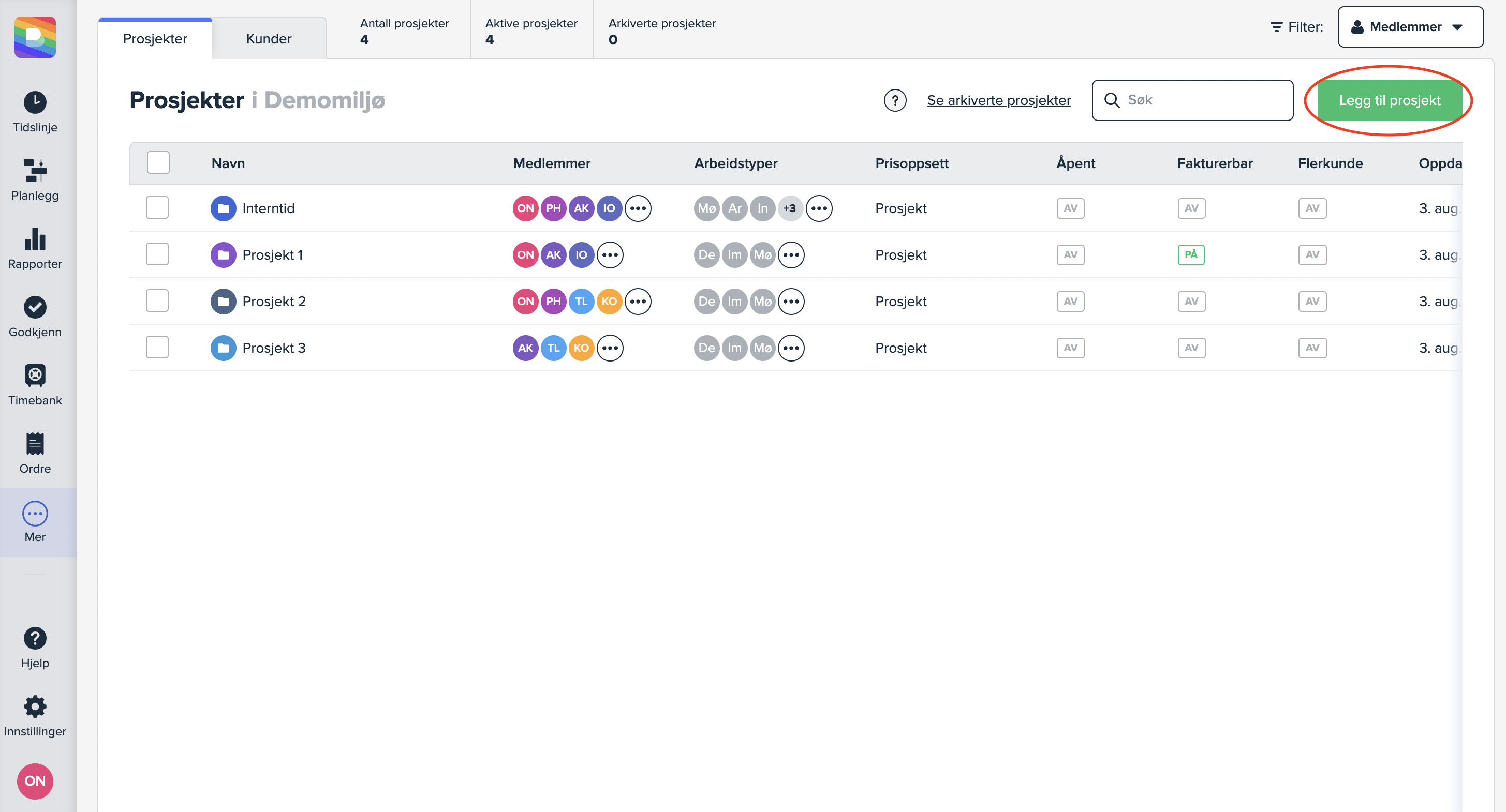 Her vil du få oversikt over alle pågående prosjekter som finnes. Ved å trykke på "Legg til prosjekt" kan du opprette et nytt prosjekt.