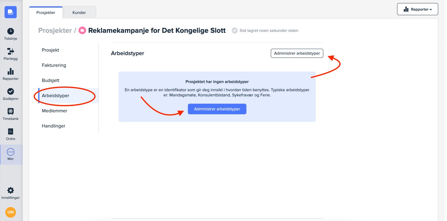 Etter at prosjektet har blitt opprettet, blir du sendt til prosjektsiden for prosjektet. For å kunne føre timer på et prosjekt, må man ha minst én arbeidstype. En arbeidstype er hva man har jobbet med på prosjektet.