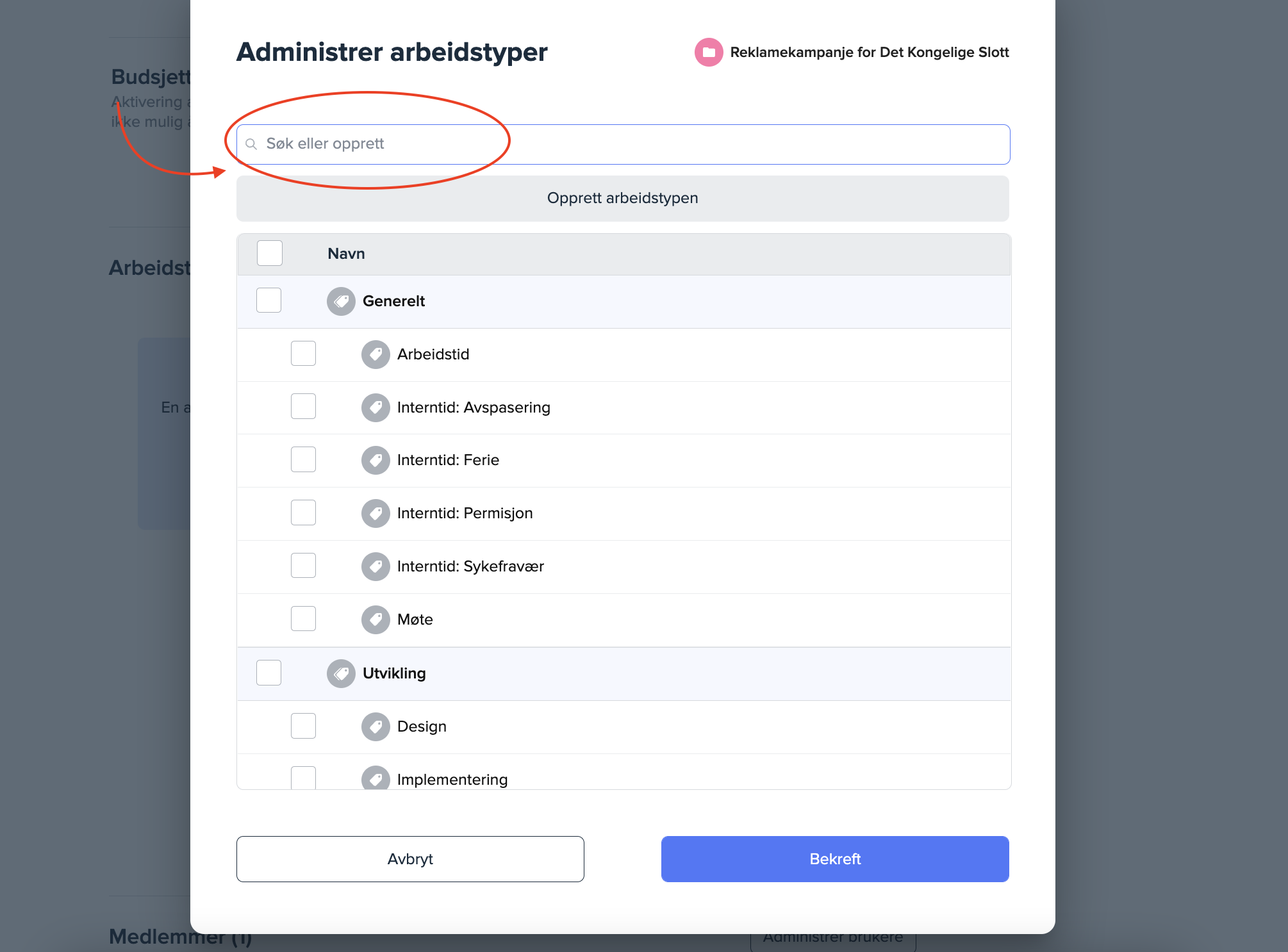 Dersom du ønsker å velge mellom eksisterende arbeidstyper kan du markere de du vil ha i listen som kommer opp (1), eller søke etter de med navn i søkefeltet. Trykk på «Bekreft» (2) for å legge til arbeidstypene.