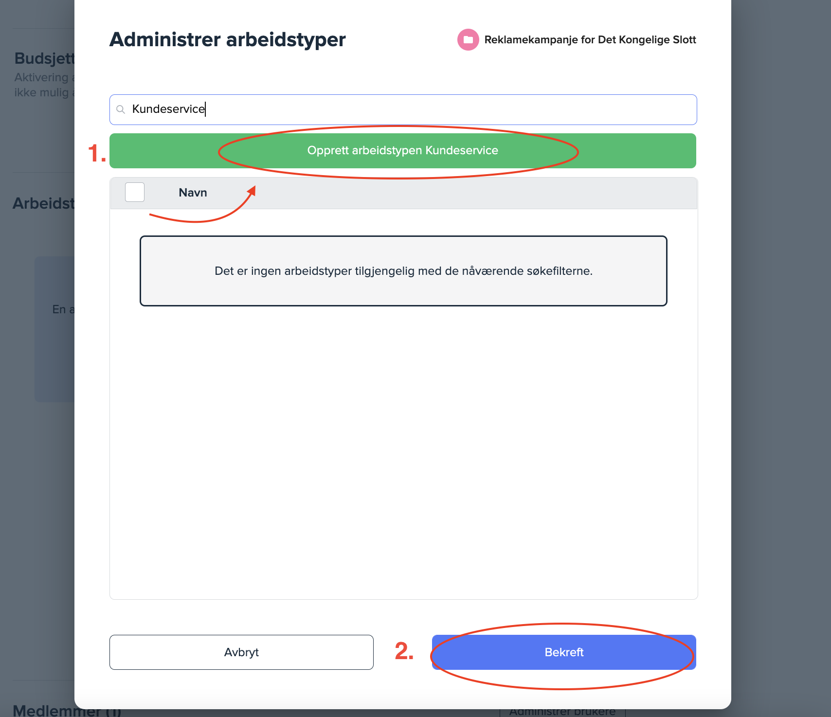 Dersom arbeidstypen ikke eksisterer fra før av vil du få opp muligheten til å opprette en ny arbeidstype. Trykk på "Opprett arbeidstypen" (1) og "Bekreft" (2) for å opprette en ny arbeidstype. Du kan repetere disse stegene for å legge til så mange arbeidstyper du ønsker.