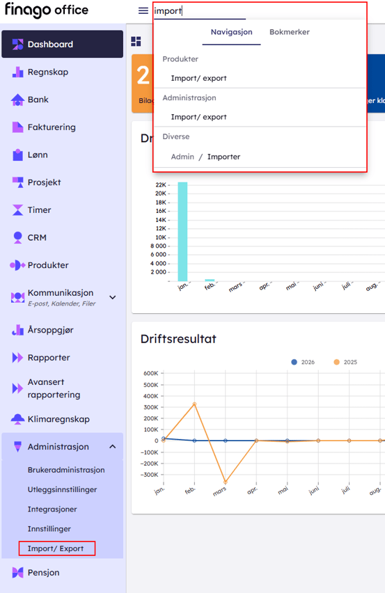 Du finner import/eksport modulen i vår hovedmeny under administrasjon eller ved å søke i søkefeltet etter import/eksport.