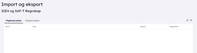 Det er her du gjør import/eksport av SIE 4 og Saf-t regnskap. Der får du opp en liste over alle pågående jobber og tidligere jobber. Du kan også her opprette en ny jobb ved å trykke på + knappen oppe i høyre hjørne.