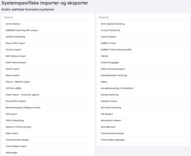 Her finner du de ulike importer/eksporter i andre format fra andre systemer. Ved å trykke på de forskjellige importene og eksportene vil du bli sendt videre til en import-veileder som hjelper deg.