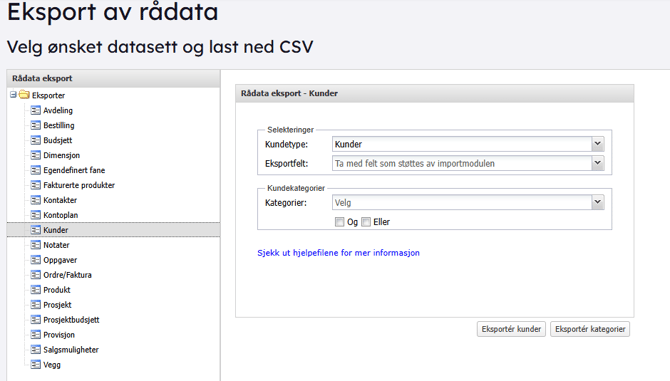 Her kan du få ut rådata av ulike data i systemet. Det kan være kunder, leverandører, faktura og produkt.