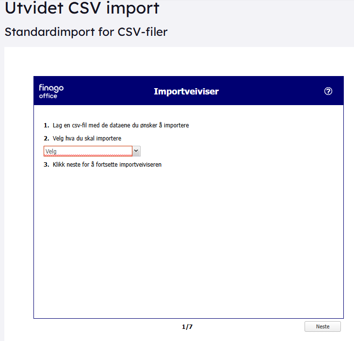 Her kan du gjøre import av CSV-filer. Du velger enkelt hva du skal importere i dropdown-menyen, og veiviseren hjelper deg videre!