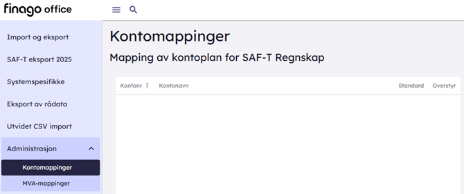 Under administrasjon kan du utføre kontomappinger og MVA mappinger hvis dere ikke følger standrad oppsett. Dette bør sjekkes igjennom før dere skal importere/eksportere.