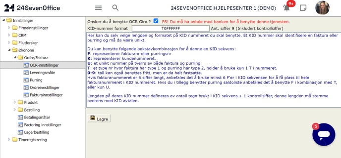 - Dersom det står på avtalen din at du skal ha for eksempel 9 siffer i KID, så må dette også settes opp i 24SevenOffice. Dette gjøres i hovedmenyen via Administrasjon → Innstillinger → Økonomi → Ordre/faktura → OCR Innstillinger. Her må avhukingen for å bruke KID avhukes. Ellers vil det ikke komme med KID på fakturautskriften.