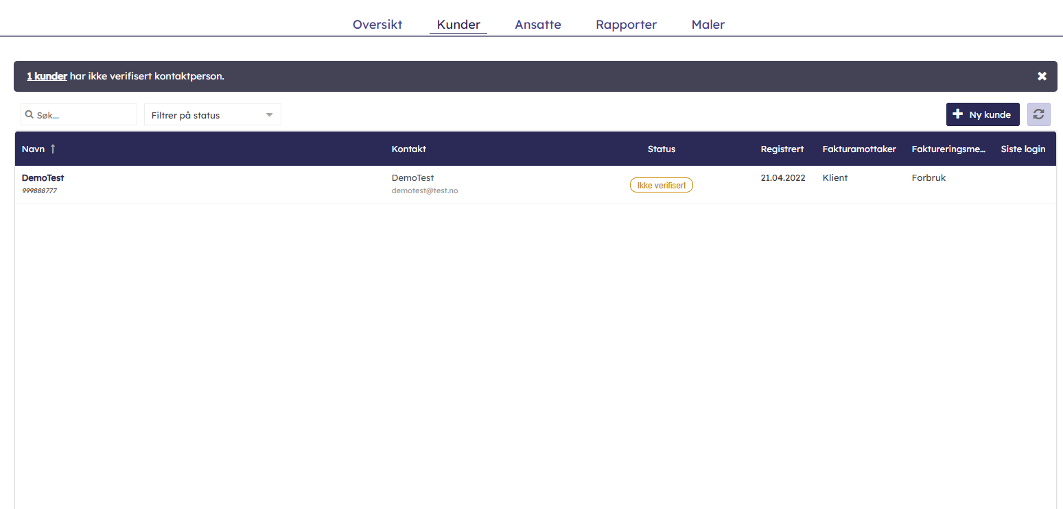 - Når du går inn i Klientadministrasjonen havner du som standard på fanen som heter “Kunder”. Her finner du en komplett liste over kundeklientene som ligger under din forhandler sin paraply. Dette er også stedet du oppretter nye klienter.