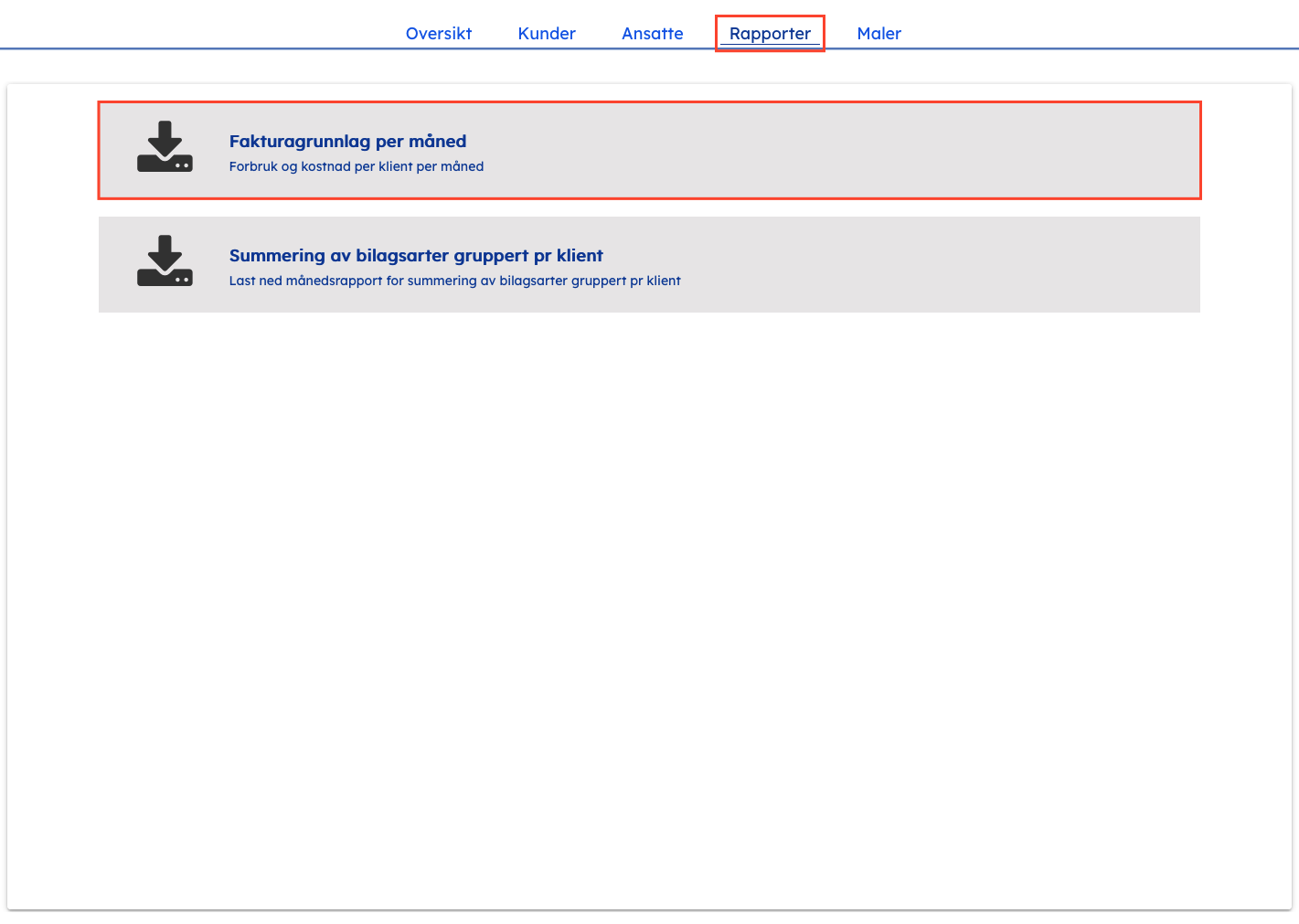 - Fra fanen kalt “Rapporter” kan du finne fakturagrunnlagsrapporten. Denne inneholder alle dine kundeklienter på egne rekker, med tilhørende grunnlagstall fra perioden du har valgt. Disse tallene er også omregnet til de relevante produktene og kostnaden forbundet med disse.