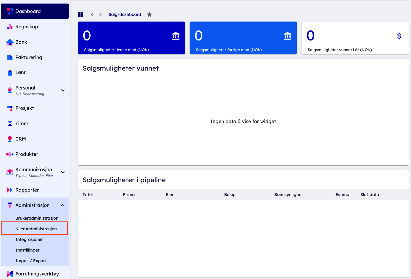 - Fra dashbordet i 24SevenOffice velger du meny elementet “Administrasjon” og utvider denne. Trykk så på “Klientadministrasjon”.