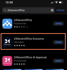 Gå til app store og søk opp 24SevenOffice, du vil da få frem appen 24SevenOffice Economy.