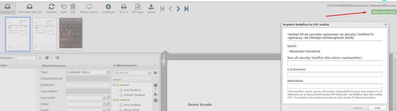 Epostadressen du ser oppe i høyre hjørne er epostadressen til mottaket. Alle bilag som sendes direkte til denne adressen vil dukke opp i innboksen i mottaket. Alle klienter har en unik mottaksadresse.