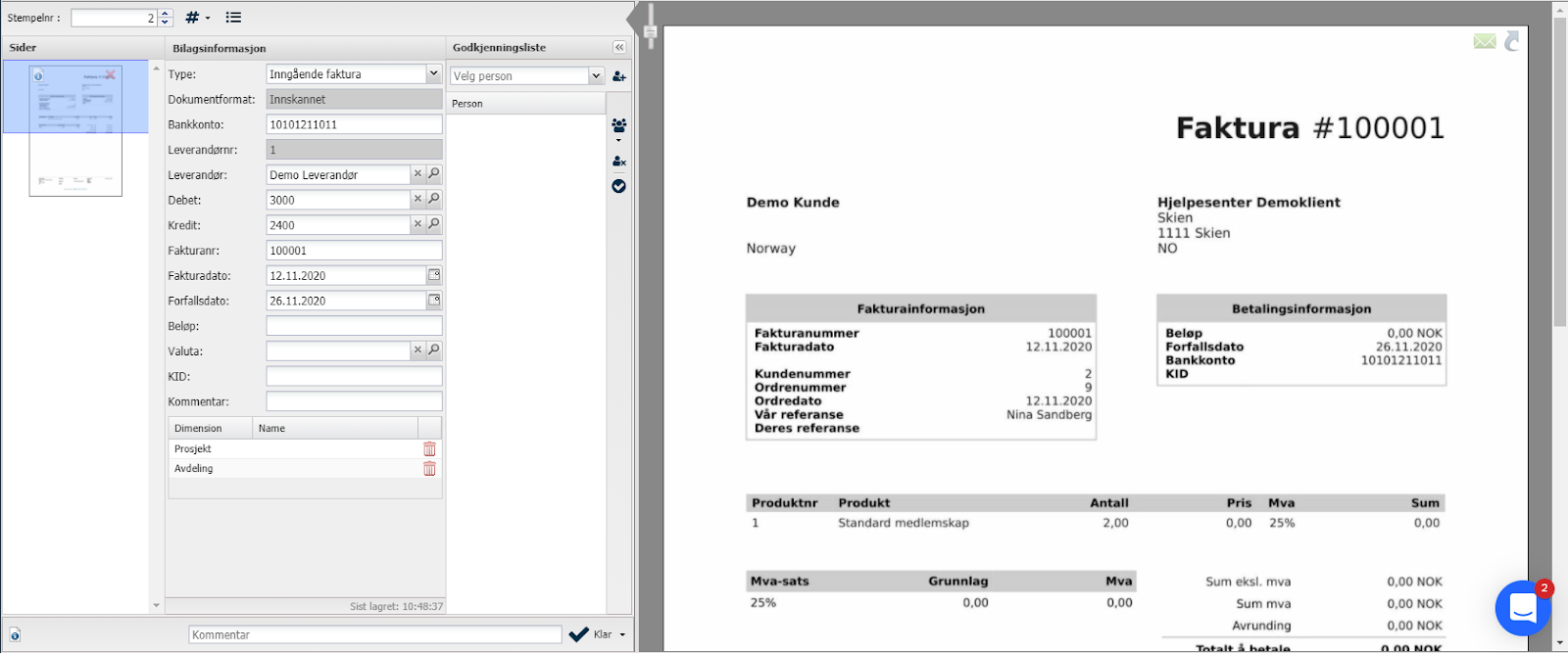 Her legger du bilaget du ønsker å jobbe med, det vises da i bildevisningen i større format. Når du legger bilaget ned her vil systemet lese av informasjonen den finner i bilaget og fylle feltene under bilagsinformasjon. Øverst i høyre hjørne i bildevisningen kan du sende bilaget videre på epost eller rotere bilaget om det ligger feil vei. Så fort bilaget er lagt under sider vil det flyttes fra innboksen til tilknyttede sider. Det røde krysset i høyre hjørne på bilaget under sider kan du benytte hvis du ønsker å løse ut bilaget fra dokumentID og flytte det tilbake til innboksen.