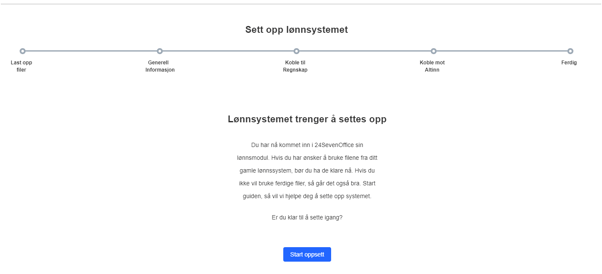 - Klikk deg inn på HR - Lønn i hovedmenyen i 24SevenOffice og du vil få opp onboarding og klikk på "Start oppsett".
