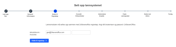 - I neste steg må du koble lønn opp mot regnskap. Du kobler profilen din i 24SevenOffice med lønnsklienten. Benytt epost og passord du bruker ved innlogging i 24SevenOffice. Trykk så på “Koble til regnskap”.