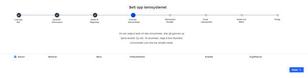 I neste steg må lønnsartene for faste poster fra importfilen kobles med tilsvarende lønnsarter i 24SevenOffice. Om det er behov for å opprette lønnsart som ikke eksisterer i 24SevenOffice, kan man nederst til høyre på siden trykke på “Opprett lønnsart”.