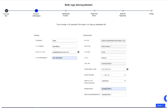 • Du kommer da til generell informasjon. Her fyller du inn brukerinformasjon og virksomhetsinformasjon. Deler av virksomhetsinformasjonen er lagt inn med du må legge inn virksomhetsnummer, bankkontonummer og velge avgiftssone samt skatte og avgiftsregel.