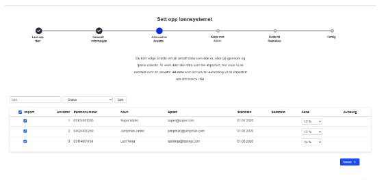 • Neste steg gir deg en oversikt over det som blir importert, her har du mulighet til å huke bort om det er ansatte som ikke skal importeres.