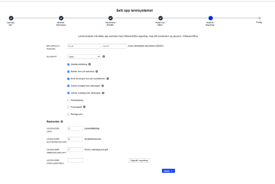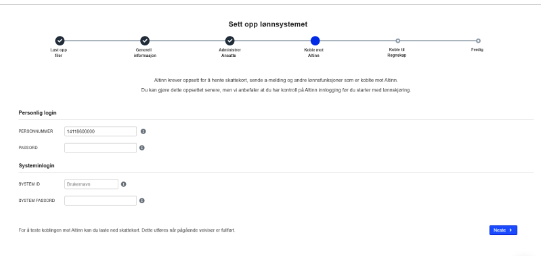 • Neste steg er å koble opp mot Altinn, dette kan gjøres på et senere tidspunkt men vi anbefaler å gjøre det før du starter med selve lønnsklienten.
