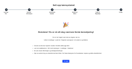 • Du er nå ferdig omboardet. Om det er noe i onboardingen du ikke har fylt ut kan dette gjøres i lønnsklienten.