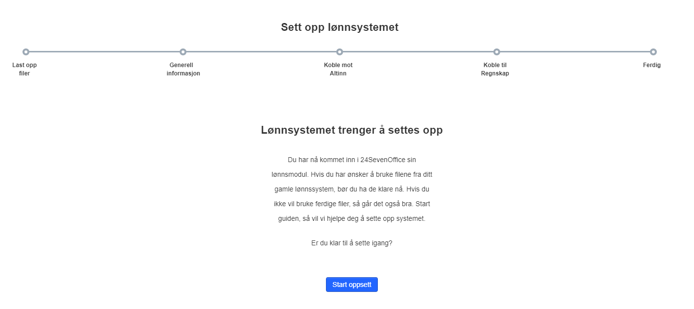 • Klikk deg inn på Lønn i hovedmenyen i Finago Office og du vil få opp onboarding og klikk på "start oppsett".