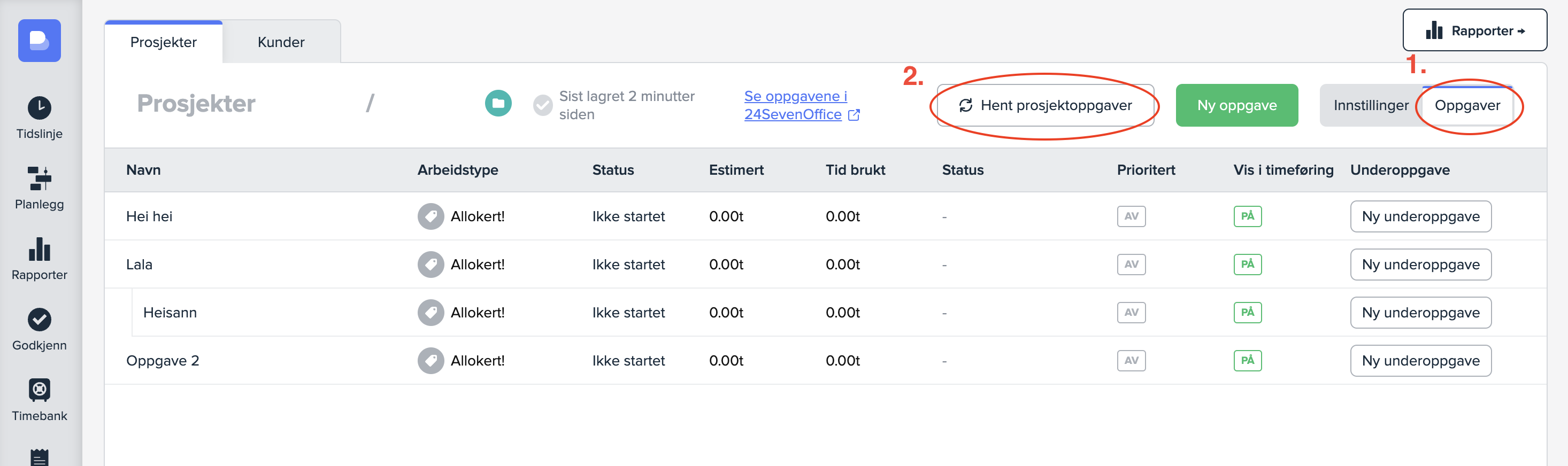Trykk «Hent prosjekteroppgaver» for å få de nyeste oppdateringene av oppgaver på prosjektet. Dette vil også gjøres automatisk en gang om dagen.