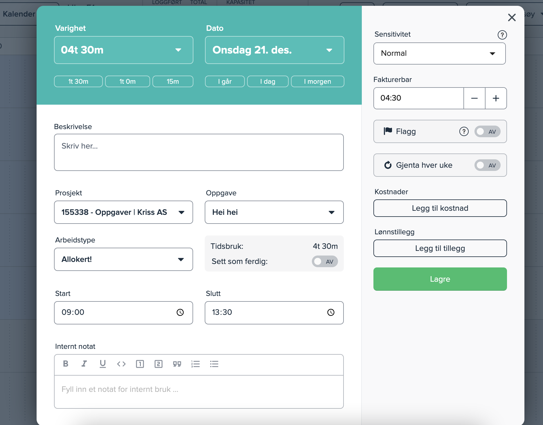 Trykk lagre, og du er ferdig med timeføring på oppgaver.