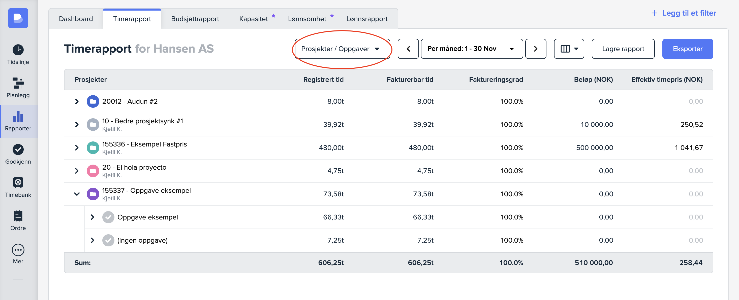 For å se tidsbruk på oppgaver kan du gå til «Rapporter» → «Rapporter» og bytte visning til «Prosjekter / Oppgaver». Da vil du kunne ekspandere linjene for å se oppgavene ført per prosjekt. Du kan også bytte øverste visningslag til brukere, slik at du kan se hvem som har jobbet på de ulike oppgavene.
